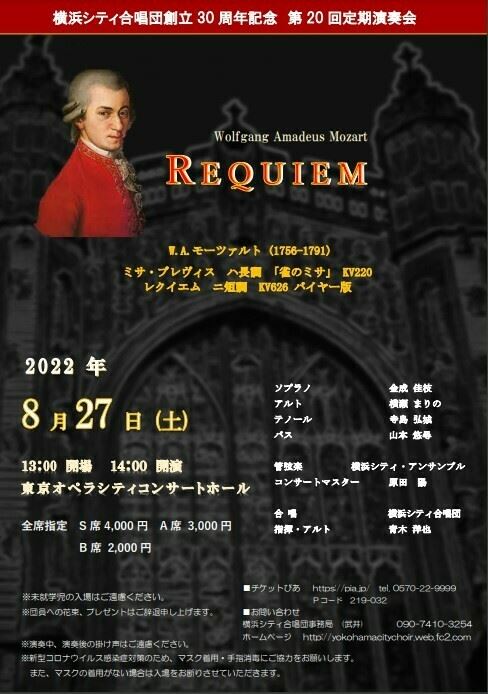 横浜シティ合唱団 創立30周年記念 第20回演奏会 22/8/27(土) 東京オペラシティ コンサートホール:タケミツメモリアル シェア ツイート モーツァルト:「レクイエム」Beyer版/モーツァルト:「ミサブレビス」KV220 公演情報 ジャンル 声楽 未就学児童は入場不可。 料金 S席-4,000円 A席-3,000円 B席-2,000円 表示できるチケット情報はありません詳しくはこちら キャスト&スタッフ 指揮 青木洋也 合唱 横浜シティ合唱団 出演 青木洋也 金成佳枝 横瀬まりの 寺島弘城 山本悠尋 原田陽 演奏 横浜シティアンサンブル お問い合わせ 横浜シティ合唱団事務局(武井) 公式サイト シェア ツイート