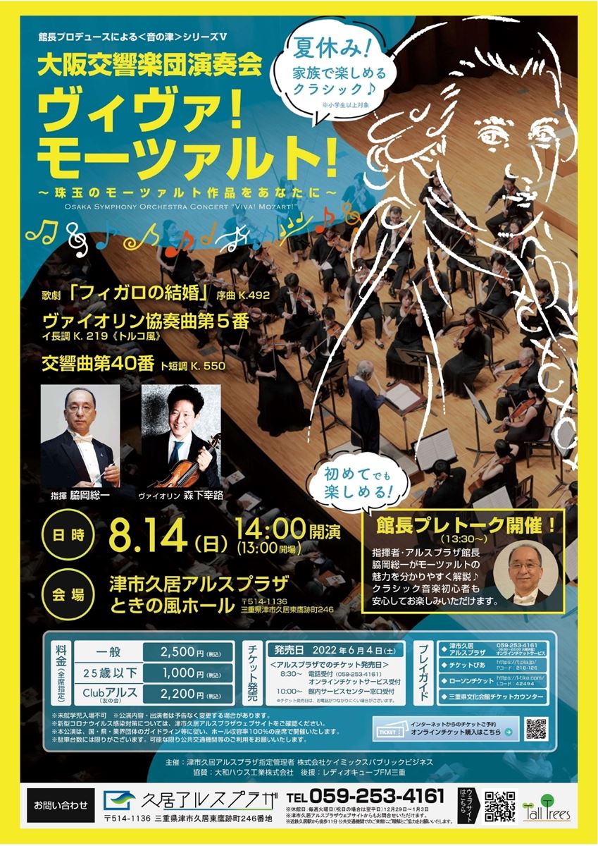 大阪交響楽団演奏会 22/8/14(日) 津市久居アルスプラザ ときの風ホール シェア ツイート ヴィヴァ!モーツァルト! ~珠玉のモーツァルト作品をあなたに~ 公演情報 ジャンル オーケストラ 未就学児童は入場不可。13:30からプレトーク開催。 料金 一般-2,500円 25歳以下-1,000円 25歳以下-小学生~25歳/入場時証明書提示要 表示できるチケット情報はありません詳しくはこちら キャスト&スタッフ 指揮 脇岡総一 ヴァイオリン 森下幸路 管弦楽 大阪交響楽団 お問い合わせ 津市久居アルスプラザ 公式サイト シェア ツイート