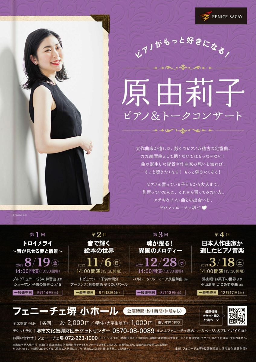 ピアノがもっと好きになる! 原由莉子 ピアノ&トークコンサート 23/3/18(土) 堺市民芸術文化ホール(フェニーチェ堺) 小ホール シェア ツイート 第4回「日本人作曲家が遺したピアノ音楽」 公演情報 ジャンル ピアノ・鍵盤楽器 未就学児入場不可。今後の感染状況や政府諸機関の方針によって、ご案内しました内容を変更させていただく場合がございます。予めご了承ください。車いす席をお求めの方は、堺市文化振興財団チケットセンター0570-08-0089にお電話ください。 料金 一般-2,000円 学生(大学生以下)-1,000円 一般-指定 学生(大学生以下)-指定 表示できるチケット情報はありません詳しくはこちら キャスト&スタッフ ピアノ 原由莉子 お問い合わせ フェニーチェ堺 公式サイト シェア ツイート