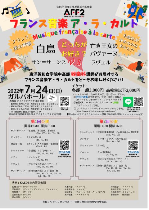 フランス音楽 ア・ラ・カルト 第1回公演 22/7/24(日) ガルバホール シェア ツイート サンサーンス「白鳥」対 「亡き王女のためのパヴァーヌの演奏対決が見ものです。 公演情報 ジャンル 室内楽 器楽 料金 自由席 一般-3,000円 自由席高校生以下-2,000円 表示できるチケット情報はありません詳しくはこちら お問い合わせ てづくりカンパニー シェア ツイート