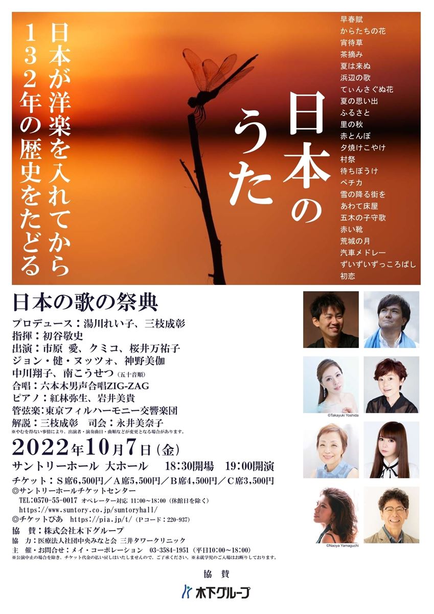 日本の歌の祭典 22/10/7(金) サントリーホール 大ホール シェア ツイート 日本が洋楽を入れてから132年の歴史をたどる 公演情報 ジャンル 声楽 未就学児童は入場不可。 料金 S席-6,500円 A席-5,500円 B席-4,500円 C席-3,500円 表示できるチケット情報はありません詳しくはこちら キャスト&スタッフ 指揮 大友直人 出演 市原愛 クミコ 桜井万祐子 ジョン・健・ヌッツォ 神野美伽 中川翔子 南こうせつ 紅林弥生 岩井美貴 合唱 六本木男声合唱団ZIG-ZAG 演奏 東京フィルハーモニー交響楽団 解説 三枝成彰 司会 永井美奈子 お問い合わせ メイ・コーポレーション 公式サイト シェア ツイート