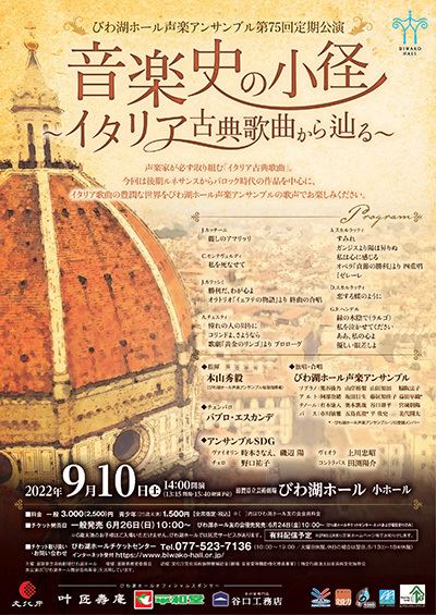 びわ湖ホール声楽アンサンブル 第75回定期公演 22/9/10(土) 滋賀県立芸術劇場 びわ湖ホール 小ホール シェア ツイート 音楽史の小径~イタリア古典歌曲から辿る~ 公演情報 ジャンル 声楽 6歳未満入場不可。 料金 一般-3,000円 青少年-1,500円 一般-指定 青少年-指定、25歳未満 表示できるチケット情報はありません詳しくはこちら キャスト&スタッフ 指揮 本山秀毅 出演 パブロ・エスカンデ アンサンブルSDG びわ湖ホール声楽アンサンブル お問い合わせ びわ湖ホール 公式サイト シェア ツイート