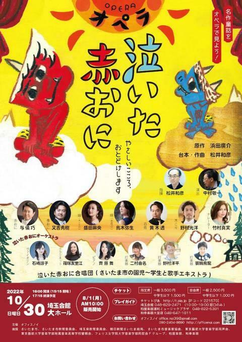 オペラ泣いた赤おに 22/10/30(日) 埼玉会館 大ホール シェア ツイート 名作童話をオペラで見よう!オペラ《泣いた赤おに》~やさしいこころ、おとどけします~ 公演情報 ジャンル 声楽 オペラ 料金 自由席 一般-2,500円 自由席 中学生以下-1,000円 表示できるチケット情報はありません詳しくはこちら キャスト&スタッフ 指揮 松井和彦 出演 与儀巧 又吉秀樹 盛田麻央 黄木透 野村光洋 鳥木弥生 竹村真実 演奏 齊藤舞 篠塚友里江 お問い合わせ オフィスノイ シェア ツイート