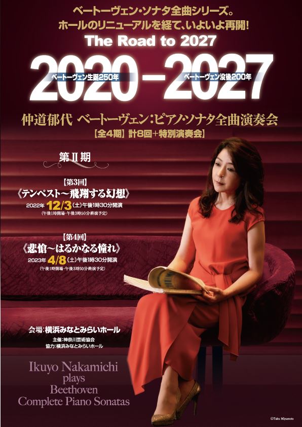 仲道郁代 ベートーヴェン:ピアノ・ソナタ全曲演奏会第Ⅱ期 第4回 〈悲愴~はるかなる憧れ〉 23/4/8(土) 横浜みなとみらいホール 大ホール シェア ツイート 8年間、全4期計8回にわたるソナタ全曲演奏会!第4回は、「ベートーヴェンの恋心、憧れ」をテーマに 公演情報 ジャンル ピアノ・鍵盤楽器 未就学児童は入場不可。他に2公演セット券あり、Pコード:780-077参照。 料金 指定席-4,800円 シルバー(65歳以上)-4,500円 舞台後方席-3,000円 表示できるチケット情報はありません詳しくはこちら キャスト&スタッフ ピアノ 仲道郁代 お問い合わせ 神奈川芸術協会 公式サイト シェア ツイート