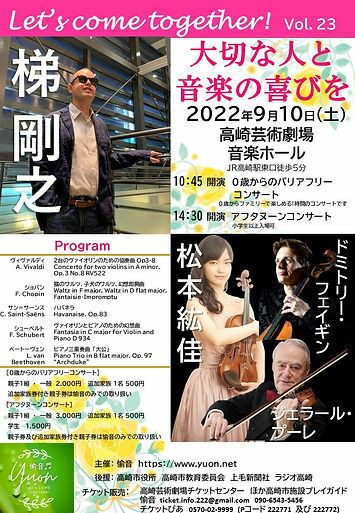 プーレ&梯剛之&松本紘佳&フェイギン 大切な人と音楽の喜びを 22/9/10(土) 高崎芸術劇場 音楽ホール シェア ツイート プーレ&梯剛之&松本紘佳&フェイギン 大切な人と音楽の喜びを 公演情報 ジャンル 室内楽 器楽 親子1組チケットは、1枚で小学生以下の方を含む親子2名まで入場可。 料金 全席自由 親子-3,000円 全席自由 一般-3,000円 全席自由 学生-1,500円 表示できるチケット情報はありません詳しくはこちら キャスト&スタッフ 出演 ジェラール・プーレ 松本紘佳 梯剛之 川島余里 ドミトリー・フェイギン お問い合わせ 愉音 シェア ツイート