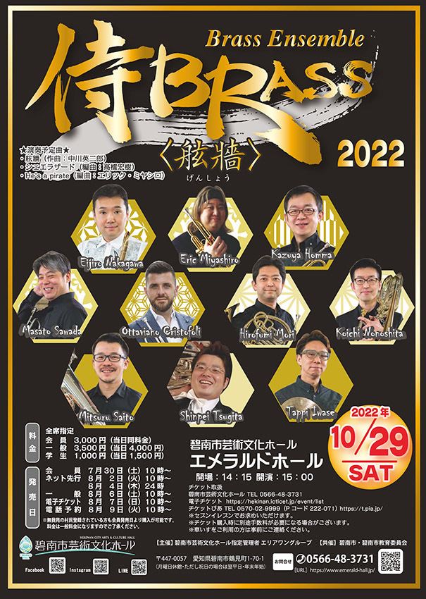 侍BRASS 22/10/29(土) 碧南市芸術文化ホール エメラルドホール シェア ツイート 国内オーケストラの首席奏者達とスタジオ界のトッププレイヤーがタッグを組んだ最強のドリームブラス。Euphoniumの金管アンサンブルがエメラルドホールに登場します。迫力ある金管アンサンブルをぜひお楽しみください。 公演情報 ジャンル 吹奏楽 ※未就学児入場不可。 料金 一般-3,500円 学生-1,000円 学生-小学生~大学生 表示できるチケット情報はありません詳しくはこちら キャスト&スタッフ 出演 侍BRASS お問い合わせ 碧南市芸術文化ホール 公式サイト シェア ツイート