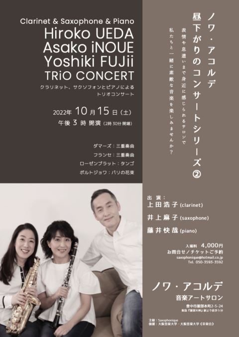 上田浩子×井上麻子×藤井快哉 トリオコンサート 22/10/15(土) ノワ・アコルデ音楽アートサロン シェア ツイート 上田浩子×井上麻子×藤井快哉 トリオコンサート 公演情報 ジャンル 室内楽 器楽 料金 全自由-4,000円 表示できるチケット情報はありません詳しくはこちら キャスト&スタッフ 出演 上田浩子 井上麻子 藤井快哉 お問い合わせ SAXOPHONIQUE シェア ツイート