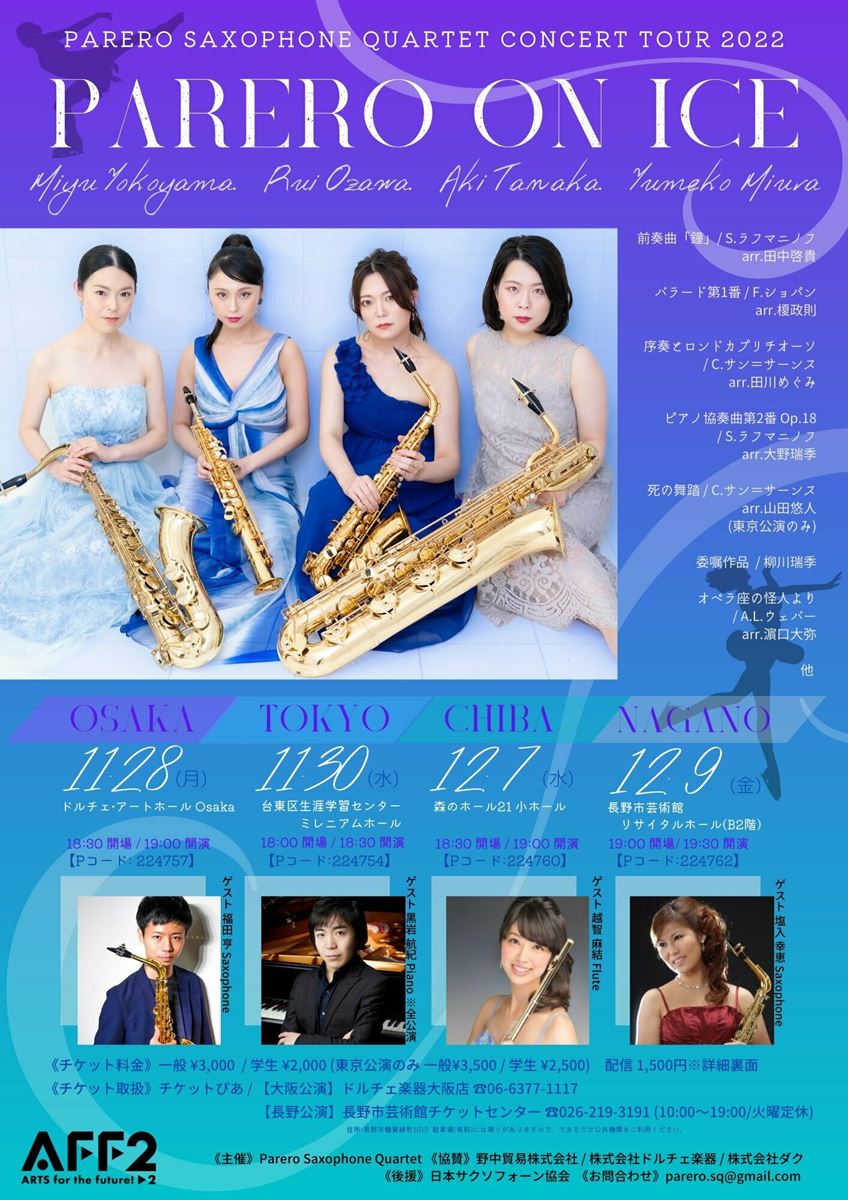 Parero on Ice 東京公演 22/11/30(水) 台東区生涯学習センター ミレニアムホール シェア ツイート パレロサクソフォンカルテットが贈るフィギュアスケートの音楽をお楽しみください。 公演情報 ジャンル 室内楽 器楽 未就学児不可。お問い合わせはメールアドレス:parer.sq@gmail.com まで。 料金 一般-3,500円 学生-2,500円 表示できるチケット情報はありません詳しくはこちら キャスト&スタッフ 出演 小澤瑠衣 田中愛希 横山美優 三浦夢子 ゲスト 黒岩航紀 お問い合わせ Parero Saxophone Quartet シェア ツイート