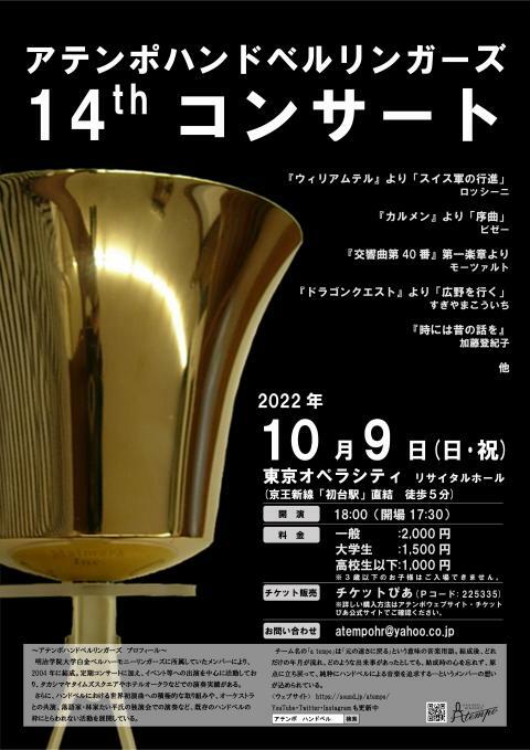 アテンポハンドベルリンガーズ 14thコンサート 22/10/9(日) 東京オペラシティ リサイタルホール シェア ツイート アテンポハンドベルリンガーズ、3年ぶりのコンサート開催! 公演情報 ジャンル 室内楽 器楽 3歳以下は入場不可。学生券は学生証の提示を求める場合あり。 料金 全席自由 一般-2,000円 全席自由大学生-1,500円 全席自由高校生以下-1,000円 表示できるチケット情報はありません詳しくはこちら キャスト&スタッフ 出演 アテンポハンドベルリンガーズ お問い合わせ アテンポハンドベルリンガーズ事務局 シェア ツイート
