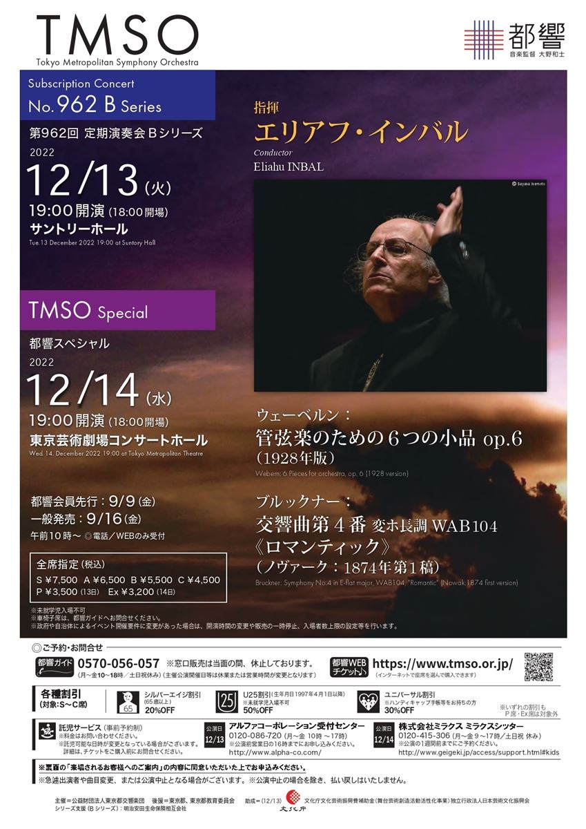 都響スペシャル 22/12/14(水) 東京芸術劇場 コンサートホール シェア ツイート ウェーベルン:管弦楽のための6つの小品 op.6(1928年版)/ブルックナー:交響曲第4番 変ホ長調 WAB104 《ロマンティック》(ノヴァーク:1874年第1稿) 公演情報 ジャンル オーケストラ 未就学児童は入場不可。以下【来場されるお客様へのご案内】を必ずご確認いただきますようお願いいたします。https://www.tmso.or.jp/j/wp/wp-content/uploads/2022/03/202204_info.pdf 料金 S席-7,500円 A席-6,500円 B席-5,500円 C席-4,500円 Ex席-3,200円 表示できるチケット情報はありません詳しくはこちら キャスト&スタッフ 指揮 エリアフ・インバル 管弦楽 東京都交響楽団 お問い合わせ 都響ガイド 公式サイト シェア ツイート