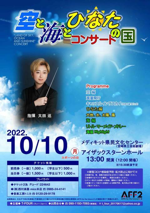 空と海とひなたの国コンサート 22/10/10(月) 宮崎県立芸術劇場 アイザックスターンホール シェア ツイート 宮崎を象徴する空、海、太陽を表現したコンサート、指揮者は太田巡氏 公演情報 ジャンル 吹奏楽 発熱、咳、体調不良など新型コロナウイルスやインフルエンザ等感染症の疑いがある症状の方は入場をご遠慮いただきます。 料金 全席自由 一般-1,000円 全席自由 学生以下-500円 表示できるチケット情報はありません詳しくはこちら お問い合わせ T-FOUR事務局 シェア ツイート