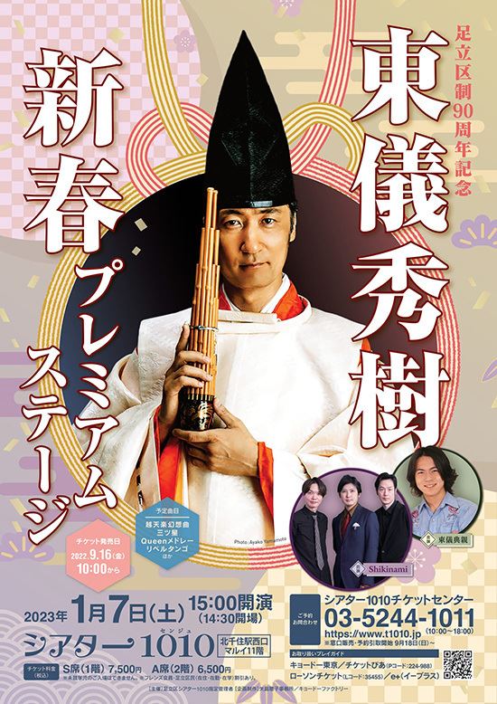 東儀秀樹 新春プレミアムステージ 23/1/7(土) THEATRE1010 シェア ツイート 千四百年の時空を超えて 〜雅楽、そして輝く未来へ〜 公演情報 ジャンル 器楽 未就学児童は入場不可。感染症予防対策に関してはシアター1010のHPをご参照ください。 料金 S席-7,500円 A席-6,500円 表示できるチケット情報はありません詳しくはこちら キャスト&スタッフ 出演 東儀秀樹 東儀典親 安達圭花 音無史哉 〆野護元 須崎時彦 中村華子 白須今 野口明生 堤博明 お問い合わせ シアター1010チケットセンター 公式サイト シェア ツイート