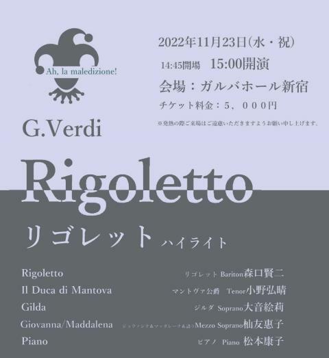 リゴレット ハイライト 22/11/23(水) ガルバホール シェア ツイート 歌劇リゴレットの名場面をわかりやすい語りを取入れた演出でお楽しみいただけるハイライト 公演情報 ジャンル 声楽 オペラ 発熱の際のご来場はご遠慮いただきますようお願い申し上げます。 料金 全席自由-5,000円 表示できるチケット情報はありません詳しくはこちら キャスト&スタッフ 出演 森口賢二 小野弘晴 大音絵里 杣友惠子 伴奏 松本康子 演出 森口賢二 お問い合わせ ガルバホール シェア ツイート