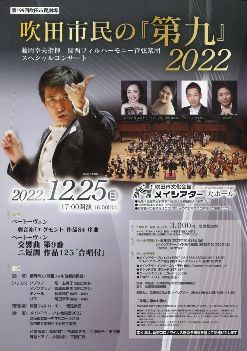第199回吹田市民劇場 吹田市民の「第九」2022 22/12/25(日) 吹田市文化会館(メイシアター) 大ホール シェア ツイート ベートーヴェン:劇音楽「エグモント」 序曲/ベートーヴェン:交響曲 第9番 合唱付 公演情報 ジャンル オーケストラ 未就学児童は入場不可。 料金 全席指定席-3,000円 表示できるチケット情報はありません詳しくはこちら キャスト&スタッフ 指揮 藤岡幸夫 管弦楽 関西フィルハーモニー管弦楽団 お問い合わせ 吹田市文化会館(メイシアター) 公式サイト シェア ツイート