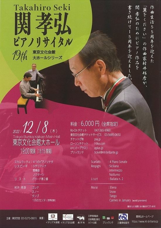 関孝弘 ピアノ・リサイタル 22/12/8(木) 東京文化会館 大ホール シェア ツイート 公演情報 ジャンル ピアノ・鍵盤楽器 未就学児童は入場不可。車椅子での来場はチケット購入前問合せ先まで要連絡。 料金 全席指定-6,000円 表示できるチケット情報はありません詳しくはこちら キャスト&スタッフ ピアノ 関孝弘 お問い合わせ Ro-On チケット シェア ツイート