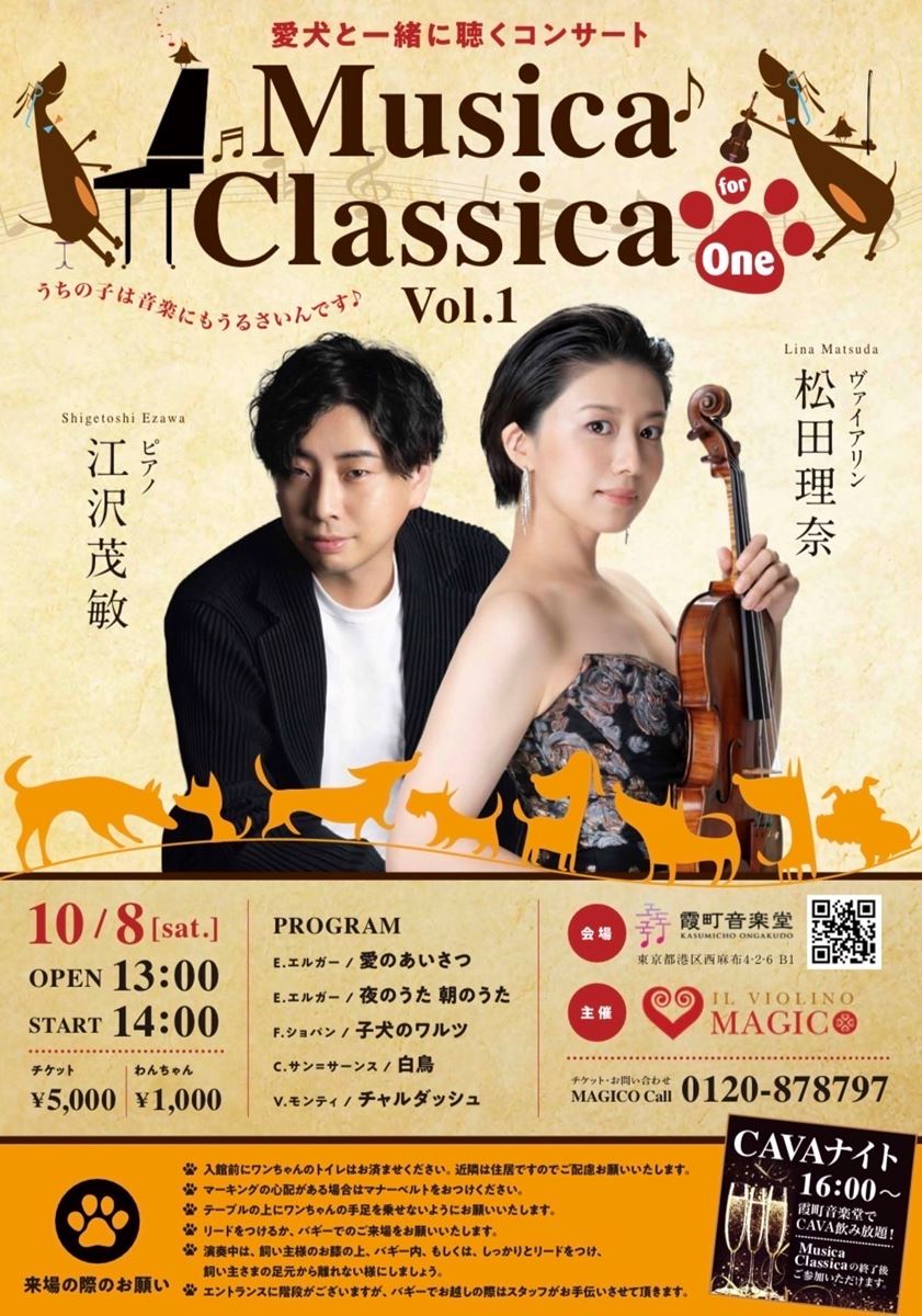 Musica Classica for One Vol.1 22/10/8(土) 霞町音楽堂 シェア ツイート 愛犬と一緒に聴くコンサート 公演情報 ジャンル 器楽 室内楽 料金 一般:5,000円ワンちゃん:1,000円 キャスト&スタッフ ヴァイオリン 松田理奈 ピアノ:江沢茂敏 お問い合わせ MAGICO Call 公式サイト シェア ツイート