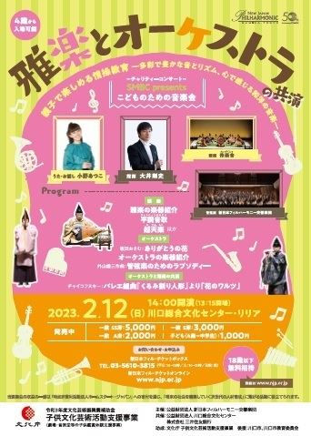 チャリティーコンサート・雅楽とオーケストラの共演 23/2/12(日) 川口総合文化センター リリア メインホール シェア ツイート 公演情報 ジャンル オーケストラ その他 4歳以上は入場可。1階の最前列は12列目になります。 料金 SS 一般-5,000円 SS 子ども(4歳~小学生)-1,000円 S 一般-3,000円 S 子ども(4歳~小学生)-1,000円 A 一般-2,000円 A 子ども(4歳~小学生)-1,000円 表示できるチケット情報はありません詳しくはこちら キャスト&スタッフ 指揮 大井剛史 出演 小野あつこ 演奏 伶楽舎 新日本フィルハーモニー交響楽団 お問い合わせ 新日本フィル・チケットボックス 公式サイト シェア ツイート