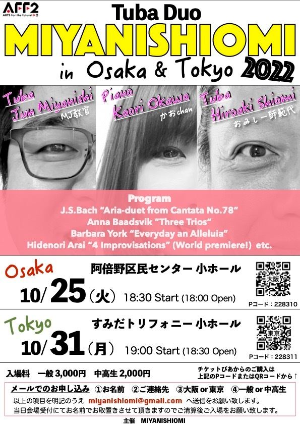 MIYANISHIOMI in Osaka 2022 22/10/25(火) 阿倍野区民センター 小ホール シェア ツイート TubaDuo「MIYANISHIOMI」待望の大阪&東京での公演が実現! 公演情報 ジャンル 器楽 料金 自由席 一般-3,000円 自由席高校生以下-2,000円 表示できるチケット情報はありません詳しくはこちら キャスト&スタッフ 出演 潮見裕章 宮西純 大川香織 お問い合わせ MIYANISHIOMI(潮見) シェア ツイート