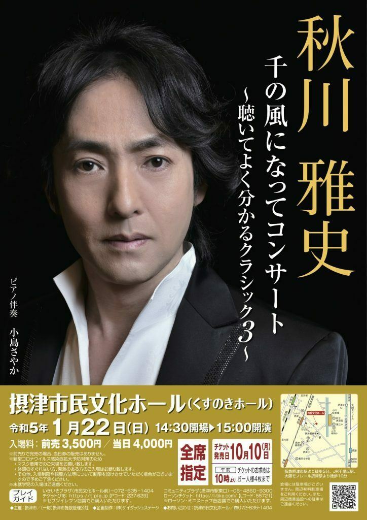 秋川雅史 千の風になってコンサート~聴いてよく分かるクラシック3~ 23/1/22(日) 摂津市民文化ホール シェア ツイート 公演情報 ジャンル 声楽 未就学児童は入場不可。新型コロナウイルス感染拡大防止のため、検温、手指消毒及びマスクの着用をお願いいたします。会場に駐車場はございませんので、お車でのご来場はご遠慮ください。 料金 一般-3,500円 一般-指定 表示できるチケット情報はありません詳しくはこちら キャスト&スタッフ テノール 秋川雅史 ピアノ 小島さやか お問い合わせ 摂津市民文化ホール 公式サイト シェア ツイート
