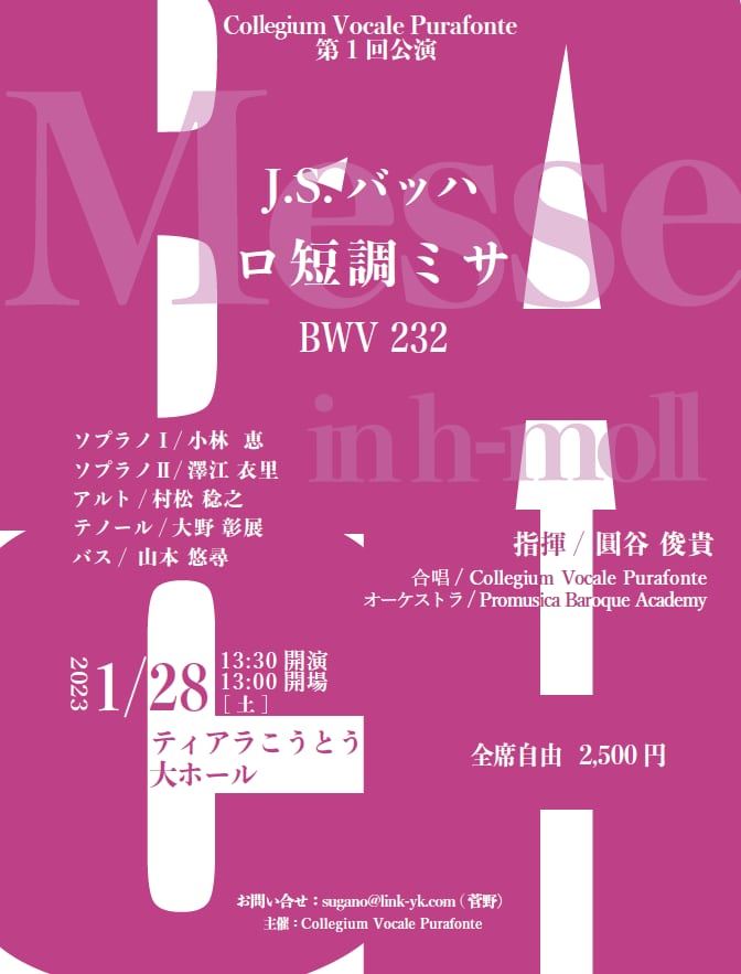 CVP第一回公演「JSバッハ ロ短調ミサ BWV232」 23/1/28(土) ティアラこうとう 大ホール シェア ツイート バッハロ短調ミサを歌うために結成した「CollegiumVocalePurafonte」の第1回公演 公演情報 ジャンル 声楽 料金 全席自由-2,500円 表示できるチケット情報はありません詳しくはこちら キャスト&スタッフ 指揮 圓谷俊貴 出演 小林恵 澤江衣里 村松稔之 大野彰展 山本悠尋 演奏 池田梨枝子 山本徹 お問い合わせ CVP 事務局 シェア ツイート