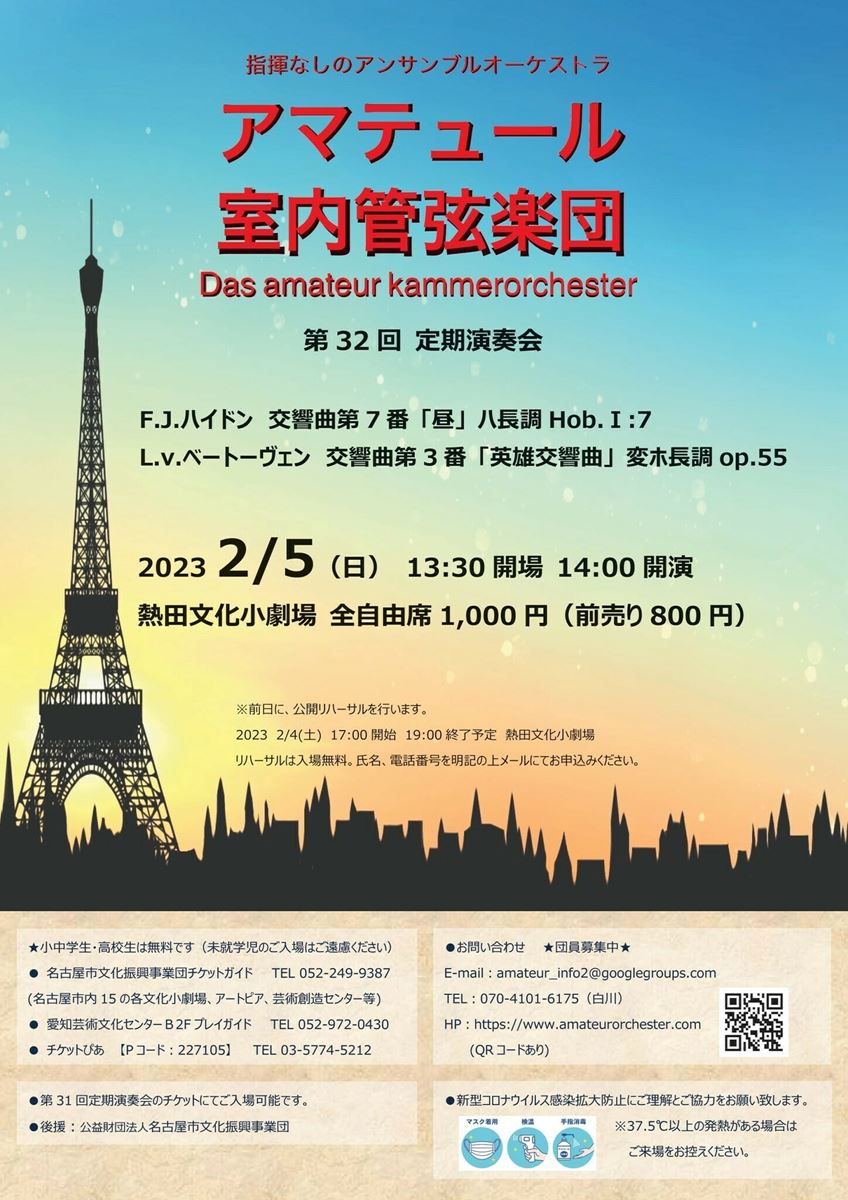 アマテュール室内管弦楽団第32回定期演奏会 23/2/5(日) 名古屋市熱田文化小劇場 シェア ツイート 指揮者なしアンサンブルオーケストラ 定期演奏会 公演情報 ジャンル オーケストラ 小中学生、高校生は無料。未就学児童は入場不可。半券裏面にお名前、ご連絡先をご記入ください。 料金 全席自由-800円 表示できるチケット情報はありません詳しくはこちら お問い合わせ アマテュール室内管弦楽団 白川 シェア ツイート