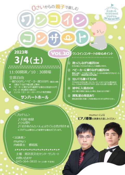 0さいからの親子で楽しむワンコインコンサートVol.20 23/3/4(土) 横浜市旭区民文化センター(サンハート) ホール シェア ツイート 公演情報 ジャンル ピアノ・鍵盤楽器 ※2歳以下は膝上無料 ※ベビーカー席(限定14席)ご希望の場合はお電話でご購入下さい。 料金 全席自由-500円 表示できるチケット情報はありません詳しくはこちら お問い合わせ 横浜市旭区民文化センターサンハート シェア ツイート