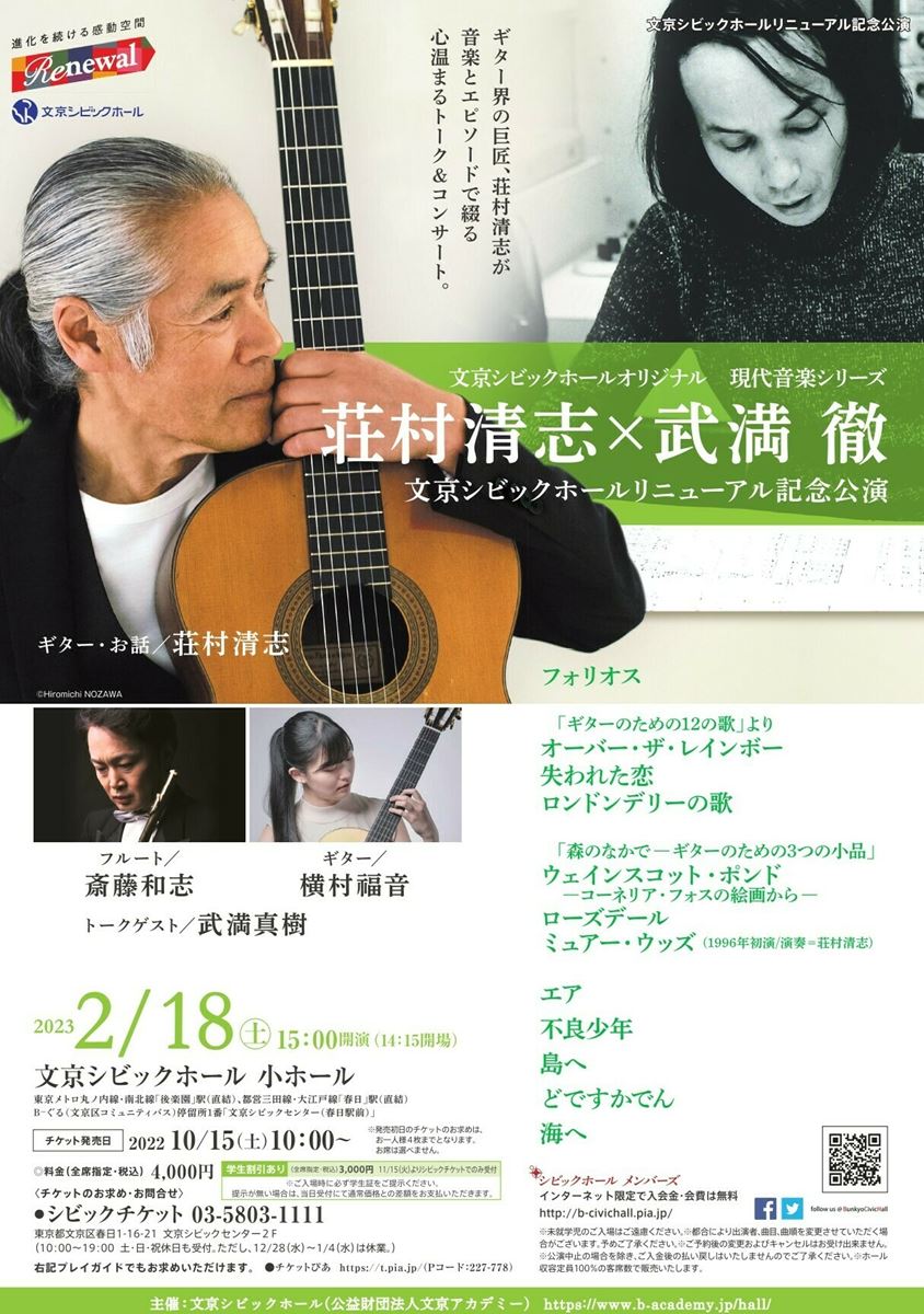 荘村清志×武満徹~文京シビックホールリニューアル記念公演~ 23/2/18(土) 文京シビックホール 小ホール シェア ツイート ギター界の巨匠、荘村清志が音楽とエピソードで綴る心温まるトーク&コンサート。 公演情報 ジャンル 器楽 室内楽 未就学児童は入場不可。 料金 全席指定-4,000円 表示できるチケット情報はありません詳しくはこちら キャスト&スタッフ ギター 荘村清志 フルート:斎藤和志/ギター:横村福音/トークゲスト:武満真樹 お問い合わせ シビックチケット 公式サイト シェア ツイート