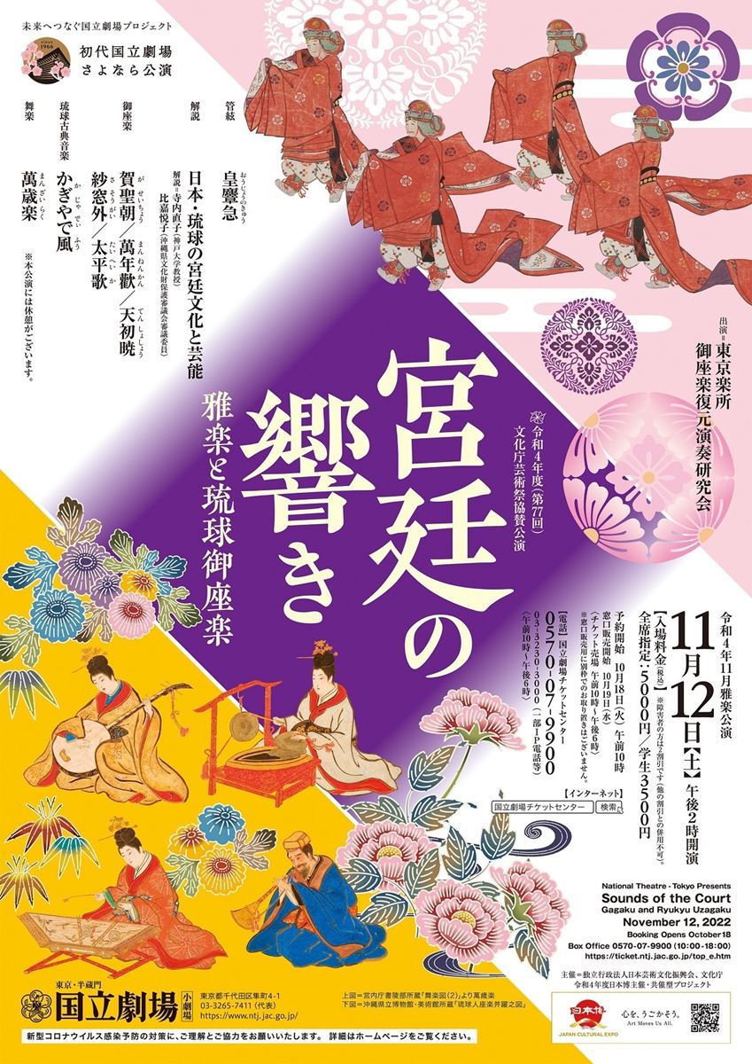 国立劇場 11月雅楽公演 宮廷の響き 雅楽と琉球御座楽 22/11/12(土) 国立劇場 小劇場 シェア ツイート 公演情報 ジャンル その他 字幕付。 料金 全席指定-5,000円 表示できるチケット情報はありません詳しくはこちら お問い合わせ 国立劇場チケットセンター シェア ツイート