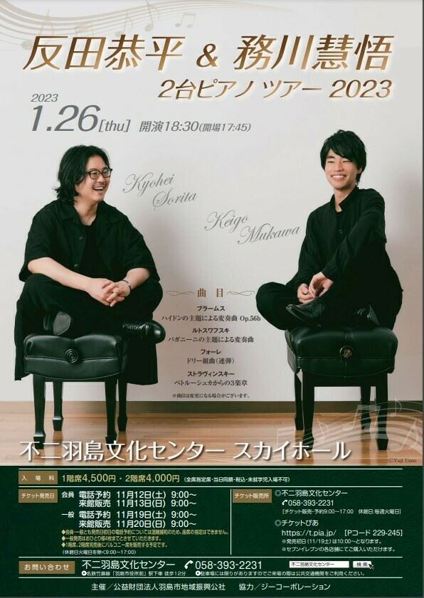 反田恭平&務川慧悟 2台ピアノツアー 2023 23/1/26(木) 不二羽島文化センター スカイホール シェア ツイート 公演情報 ジャンル ピアノ・鍵盤楽器 ※未就学児入場不可 料金 S指定席-4,500円 A指定席-4,000円 表示できるチケット情報はありません詳しくはこちら キャスト&スタッフ 出演 反田恭平 務川慧悟 お問い合わせ 不二羽島文化センター 公式サイト シェア ツイート