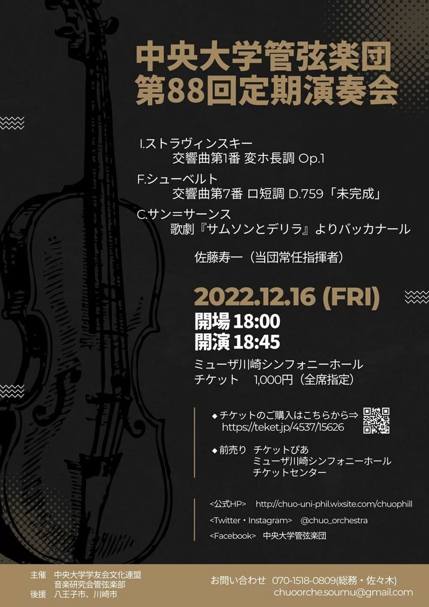 中央大学管弦楽団 第88回定期演奏会 22/12/16(金) ミューザ川崎シンフォニーホール シェア ツイート 公演情報 ジャンル オーケストラ 未就学児童は入場不可。新型コロナウイルス感染拡大防止のため、お席の間隔を空けての販売となります。2枚以上申込の場合、お席が離れる旨の警告がでます。 料金 全席指定-1,000円 表示できるチケット情報はありません詳しくはこちら キャスト&スタッフ メイン 中央大学管弦楽団 お問い合わせ 中央大学管弦楽団 総務 シェア ツイート
