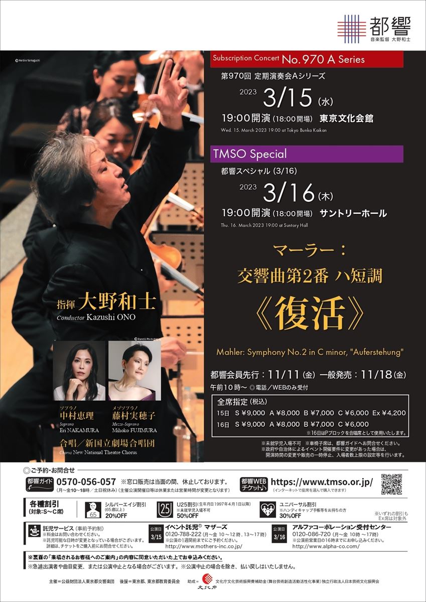 東京都交響楽団 第970回定期演奏会Aシリーズ 23/3/15(水) 東京文化会館 大ホール シェア ツイート マーラー:交響曲第2番 ハ短調《復活》 公演情報 ジャンル オーケストラ 未就学児童は入場不可。以下【来場されるお客様へのご案内】を必ずご確認いただきますようお願いいたします。https://www.tmso.or.jp/j/wp/wp-content/uploads/2022/10/202209_info.pdf 料金 S席-9,000円 A席-8,000円 B席-7,000円 C席-6,000円 Ex席-4,200円 表示できるチケット情報はありません詳しくはこちら キャスト&スタッフ 指揮 大野和士 管弦楽 東京都交響楽団 ソプラノ 中村恵理 メゾソプラノ 藤村実穂子 合唱 新国立劇場合唱団 お問い合わせ 都響ガイド 公式サイト シェア ツイート