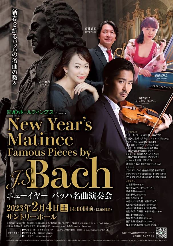 ニューイヤー バッハ名曲演奏会 23/2/4(土) サントリーホール 大ホール シェア ツイート 新春を飾るJ.S.バッハの名曲の数々 公演情報 ジャンル 室内楽 器楽 未就学児童は入場不可。曲目曲順・出演者等は予定のため変更の可能性あり。 料金 S席-7,000円 A席-6,000円 B席-5,000円 表示できるチケット情報はありません詳しくはこちら キャスト&スタッフ 出演 大木麻理 斎藤秀範 崎谷直人 三原久遠 東亮汰 直江智沙子 桜田悟 菊川穂乃佳 大島亮 瀧本麻衣子 濱本実加 高野香子 森野開 木田奏帆 桑田歩 懸田貴嗣 渡邊方子 飯島哲蔵 菅沼希望 廣永瞬 梶川真歩 櫻井茂 清水愛架 西山まりえ お問い合わせ ムジカキアラ シェア ツイート
