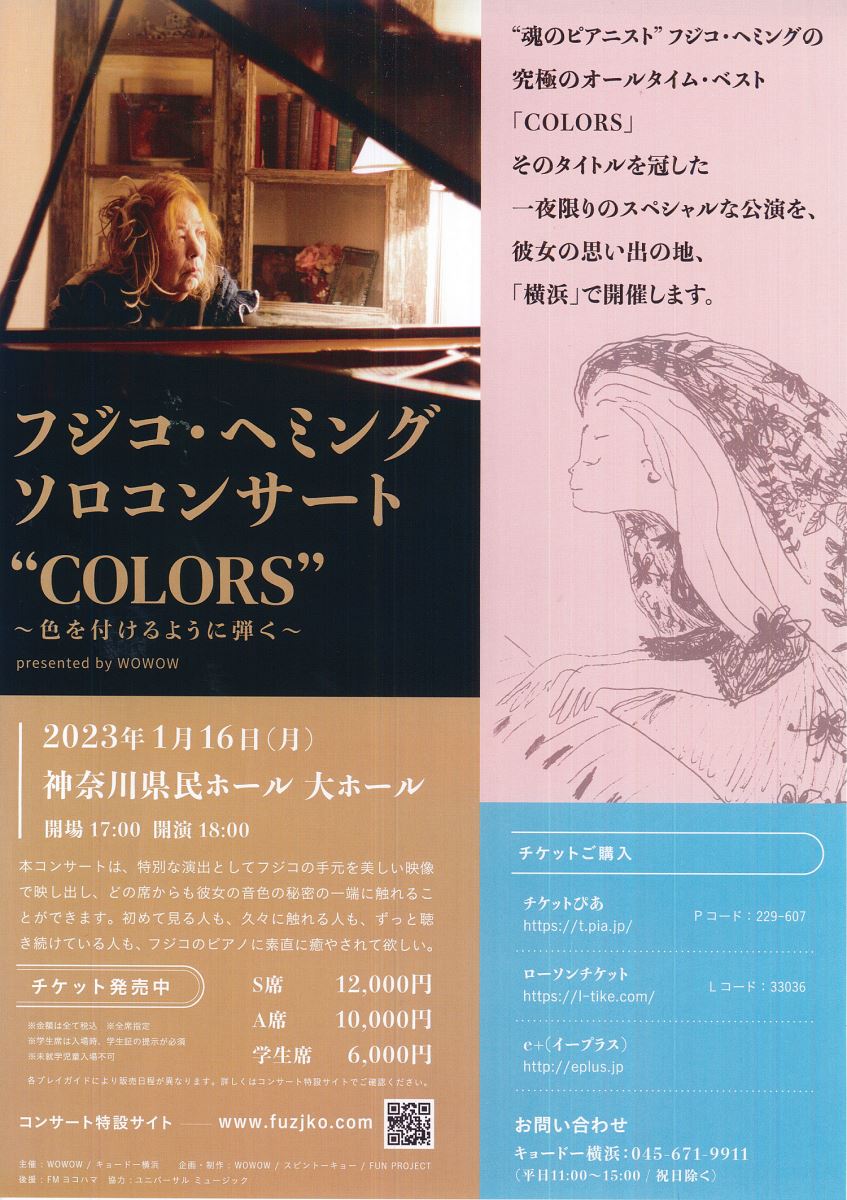 フジコ・ヘミング ソロコンサート “COLORS” ~色を付けるように弾く~ presented by WOWOW 23/1/16(月) 神奈川県民ホール 大ホール シェア ツイート 公演情報 ジャンル ピアノ・鍵盤楽器 未就学児童は入場不可。 料金 全席指定S席-12,000円 全席指定A席-10,000円 全席指定学生席-6,000円 全席指定学生席-公演当日要学生証 表示できるチケット情報はありません詳しくはこちら キャスト&スタッフ ピアノ フジコ・ヘミング お問い合わせ キョードー横浜 公式サイト シェア ツイート