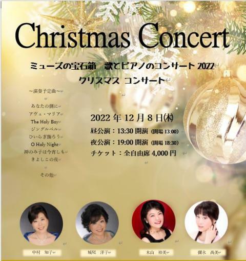 クリスマス・コンサート 歌とピアノのコンサート2022 22/12/8(木) ガルバホール シェア ツイート ミューズの宝石箱 歌とピアノのコンサート2022 クリスマス コンサート 公演情報 ジャンル 声楽 発熱の際のご来場はお控え下さい。当日は係員の誘導に従ってご対応くださいますようお願い申し上げます。 料金 全席自由-4,000円 表示できるチケット情報はありません詳しくはこちら キャスト&スタッフ 出演 木山裕美 城尾洋子 彌永尚美 中村知子 お問い合わせ ガルバホール シェア ツイート
