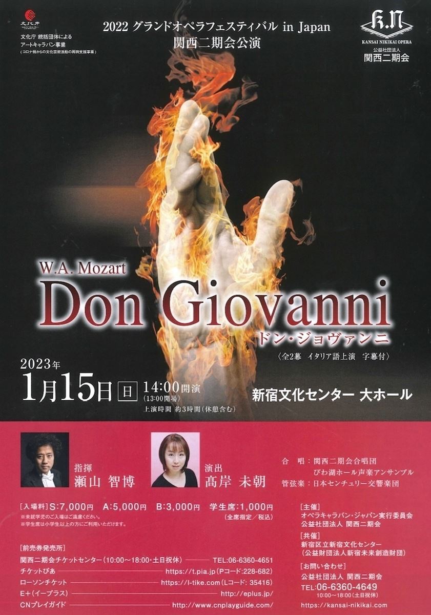 2022 グランドオペラフェスティバル in Japan 関西二期会公演 歌劇『ドン・ジョヴァンニ』 23/1/15(日) 新宿文化センター 大ホール シェア ツイート W.A.モーツァルト作曲<全2幕/イタリア語上演/字幕付> 公演情報 ジャンル 声楽 オペラ 未就学児童は入場不可。学生席チケットは、小学生以上の方にご購入頂けます。身分証の提示の必要はありません。全2幕 イタリア語上演・字幕付。 料金 S席-7,000円 A席-5,000円 B席-3,000円 学生席-1,000円 表示できるチケット情報はありません詳しくはこちら キャスト&スタッフ 指揮 瀬山智博 演出 高岸未朝 出演 萩原寛明 萩原泰介 木澤佐江子 秋本靖仁 佐竹しのぶ 萬田一樹 谷本尚隆 岩本実奈子 演奏 日本センチュリー交響楽団 合唱 関西二期会合唱団 びわ湖ホール声楽アンサンブル お問い合わせ 関西二期会 公式サイト シェア ツイート
