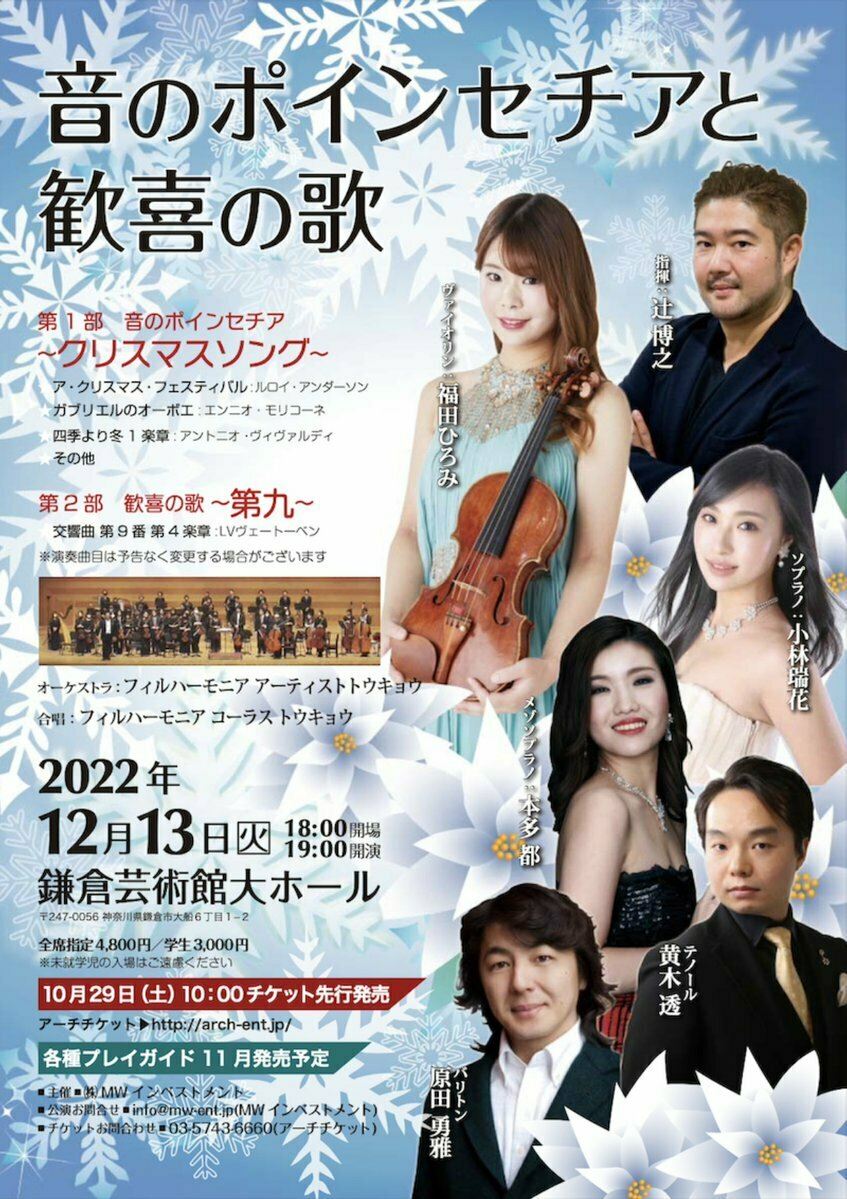 音のポインセチアと歓喜の歌 22/12/13(火) 鎌倉芸術館 大ホール シェア ツイート 公演情報 ジャンル 声楽 オペラ 未就学児童は入場不可。曲目は都合により変更の可能性あり。 料金 全席指定-4,800円 表示できるチケット情報はありません詳しくはこちら キャスト&スタッフ 指揮 辻博之 出演 福田ひろみ 小林瑞花 本多都 黄木透 原田勇雅 合唱 フィルハーモニアコーラストウキョウ 演奏 フィルハーモニアアーティストTOKYO お問い合わせ アーチ・チケット シェア ツイート