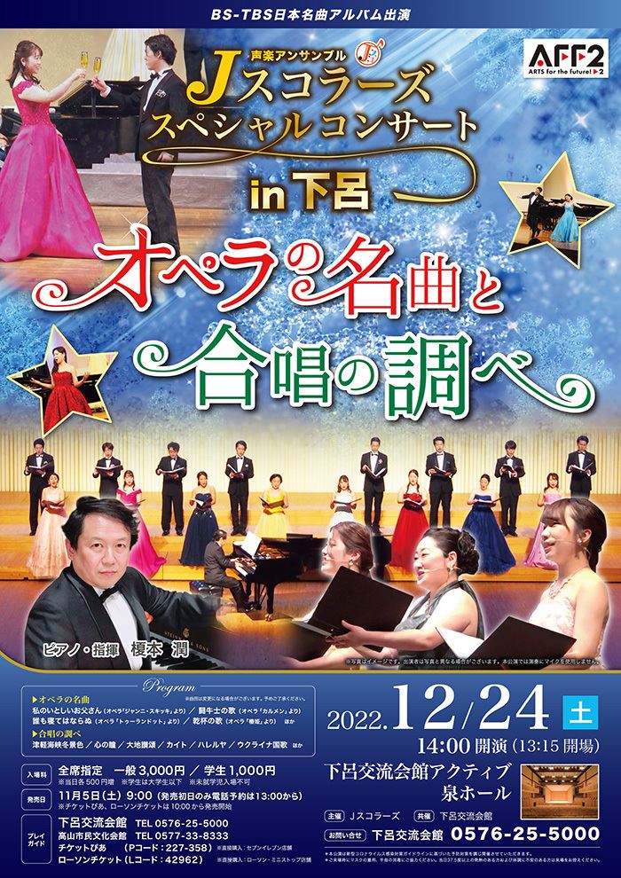 Jスコラーズ・スペシャルコンサート in 下呂 22/12/24(土) 下呂交流会館 泉ホール シェア ツイート オペラの名曲と合唱の調べ 公演情報 ジャンル 声楽 未就学児童は入場不可。ホール内での飲食はできません。車いす席をご希望の方は、下呂交流会館までお問合せ下さい。感染防止対策にご協力下さい。詳しくは下呂交流会館ホームページをご確認ください。 料金 全席指定 一般-3,000円 全席指定 大学生以下-1,000円 表示できるチケット情報はありません詳しくはこちら キャスト&スタッフ 出演 Jスコラーズ 榎本潤 お問い合わせ 下呂交流会館 公式サイト シェア ツイート
