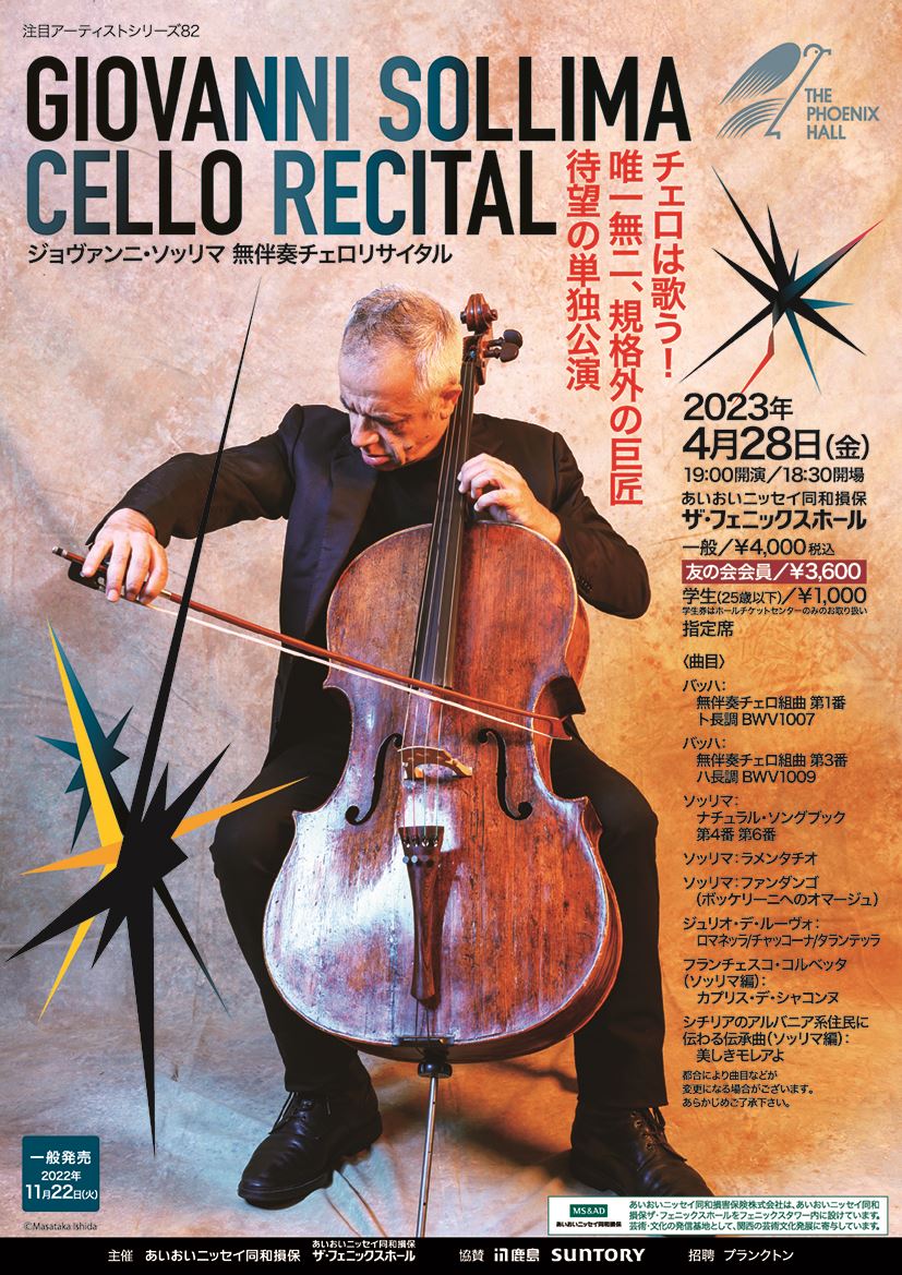 ジョヴァンニ・ソッリマ 無伴奏チェロリサイタル 23/4/28(金) あいおいニッセイ同和損保 ザ・フェニックスホール シェア ツイート チェロは歌う! 唯一無二、規格外の巨匠、待望の単独公演 公演情報 ジャンル 器楽 室内楽 未就学児童は入場不可。 料金 一般-4,000円 一般-指定 表示できるチケット情報はありません詳しくはこちら キャスト&スタッフ チェロ ジョヴァンニ・ソッリマ お問い合わせ ザ・フェニックスホールチケットセンター 公式サイト シェア ツイート