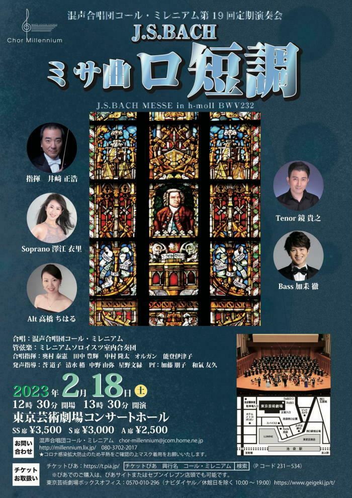 混声合唱団コール・ミレニアム 第19回定期演奏会 23/2/18(土) 東京芸術劇場 コンサートホール シェア ツイート J.S.BACH:ミサ曲「ロ短調 BWV232」 公演情報 ジャンル 声楽 コロナ感染拡大防止のため平熱をご確認の上マスク着用をお願いいたします。 料金 SS席-3,500円 S席-3,000円 A席-2,500円 表示できるチケット情報はありません詳しくはこちら キャスト&スタッフ 合唱 混声合唱団コール・ミレニアム 指揮 井崎正浩 ソプラノ 澤江衣里 アルト 高橋ちはる テノール 鏡貴之 バス 加耒徹 管弦楽 ミレニアムソロイスツ管弦楽団 お問い合わせ コール・ミレニアム 公式サイト シェア ツイート