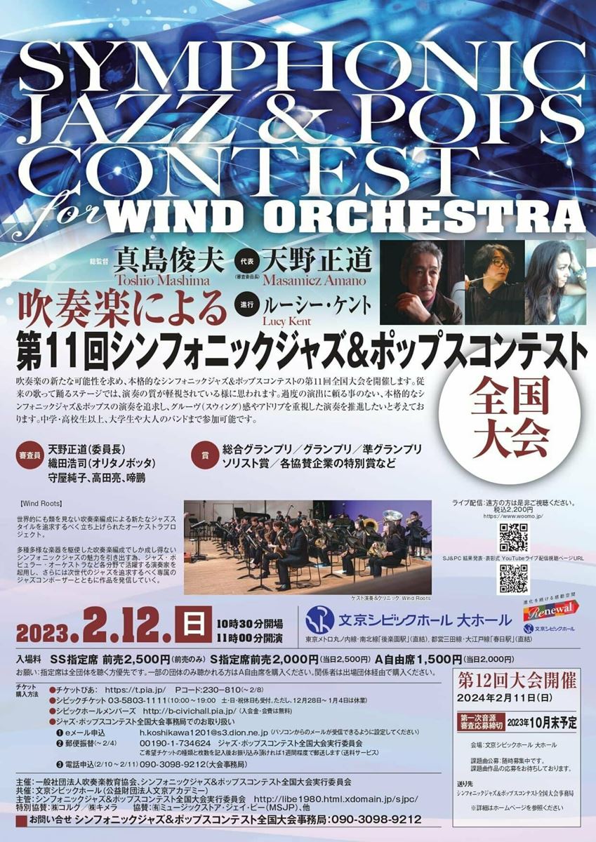 第11回シンフォニックジャズ&ポップスコンテスト全国大会 23/2/12(日) 文京シビックホール 大ホール シェア ツイート 公演情報 ジャンル フェスティバル 未就学児童は入場不可。指定席は全団体を聴く方限定です。一部の団体のみ聴く場合はA自由席を購入してください。 料金 SS指定-2,500円 S指定-2,000円 A自由-1,500円 表示できるチケット情報はありません詳しくはこちら お問い合わせ 実行委員会事務局 シェア ツイート