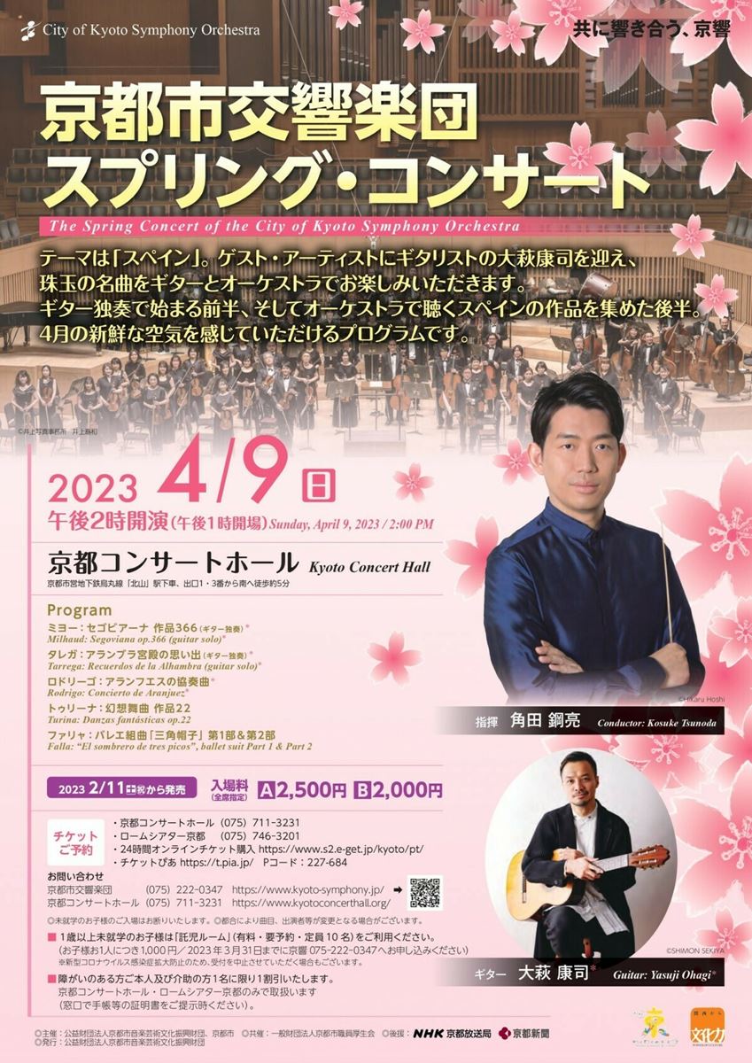 京都市交響楽団 スプリング・コンサート 23/4/9(日) 京都コンサートホール 大ホール シェア ツイート ミヨー:セゴビアーナ 作品366(ギター独奏)/タレガ:アランブラ宮殿の思い出(ギター独奏)/ロドリーゴ:アランフエスの協奏曲/トゥリーナ:幻想舞曲 作品22/ファリャ:バレエ組曲「三角帽子」 第1部&第2部 公演情報 ジャンル オーケストラ 未就学児童は入場不可。 料金 A席-2,500円 B席-2,000円 表示できるチケット情報はありません詳しくはこちら キャスト&スタッフ 指揮 角田鋼亮 管弦楽 京都市交響楽団 ギター 大萩康司 お問い合わせ 京都市交響楽団 公式サイト シェア ツイート