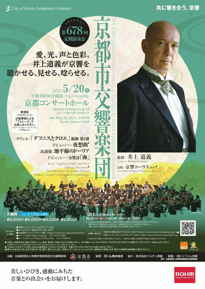 京都市交響楽団 第678回定期演奏会 23/5/20(土) 京都コンサートホール 大ホール シェア ツイート ラヴェル:「ダフニスとクロエ」組曲 第2番/ドビュッシー:夜想曲/武満徹:地平線のドーリア/ドビュッシー:交響詩「海」 公演情報 ジャンル オーケストラ 未就学児童は入場不可。 料金 S席-5,500円 A席-5,000円 B席-4,000円 C席-3,000円 表示できるチケット情報はありません詳しくはこちら キャスト&スタッフ 指揮 井上道義 管弦楽 京都市交響楽団 合唱 京響コーラス女声 お問い合わせ 京都市交響楽団 公式サイト シェア ツイート