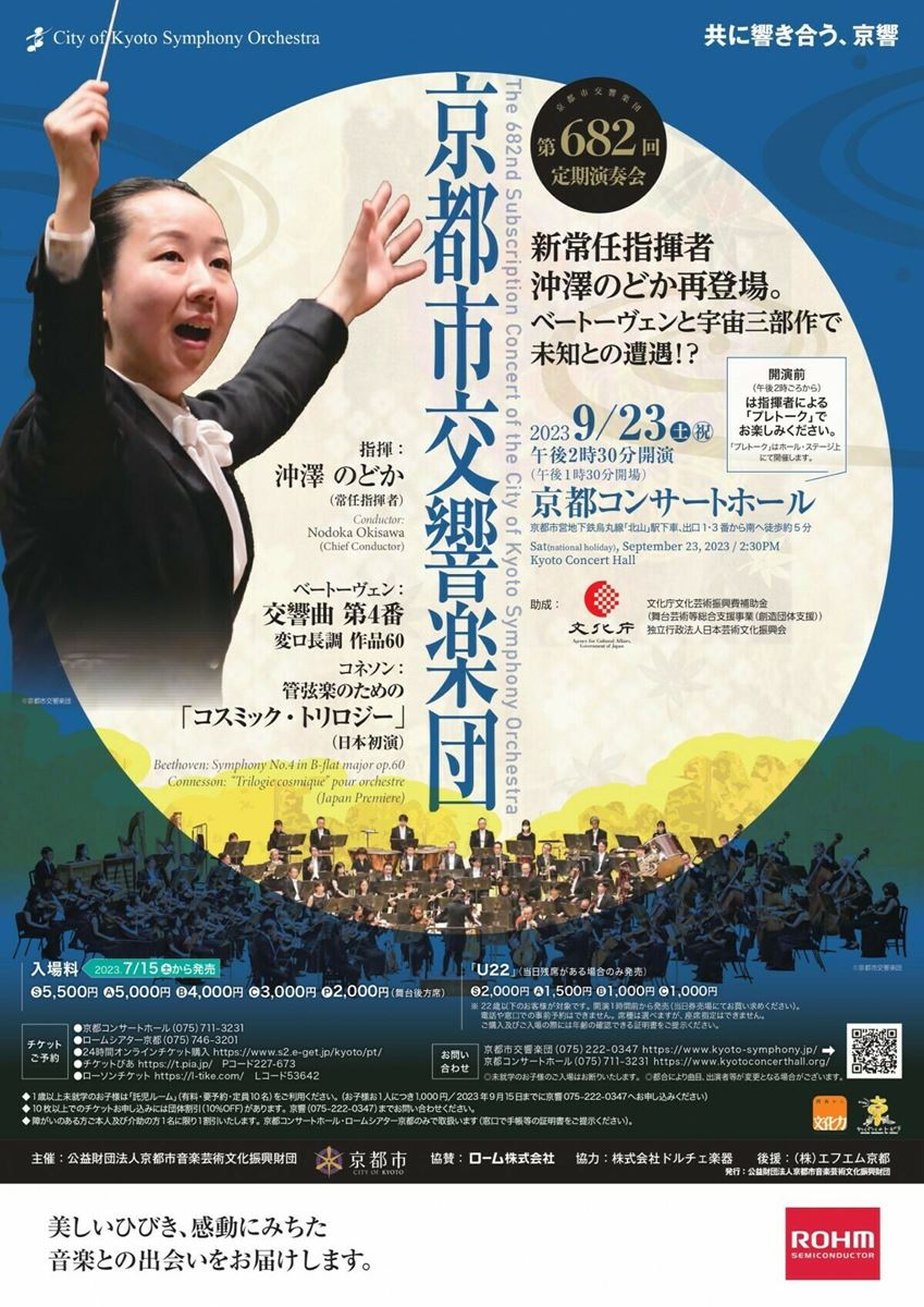 京都市交響楽団 第682回定期演奏会 23/9/23(土) 京都コンサートホール 大ホール シェア ツイート ベートーヴェン:交響曲 第4番 変ロ長調 作品60/コネソン:管弦楽のための「コスミック・トリロジー」(日本初演) 公演情報 ジャンル オーケストラ 未就学児童は入場不可。 料金 S席-5,500円 A席-5,000円 B席-4,000円 C席-3,000円 P席-2,000円 表示できるチケット情報はありません詳しくはこちら キャスト&スタッフ 指揮 沖澤のどか 管弦楽 京都市交響楽団 お問い合わせ 京都市交響楽団 公式サイト シェア ツイート