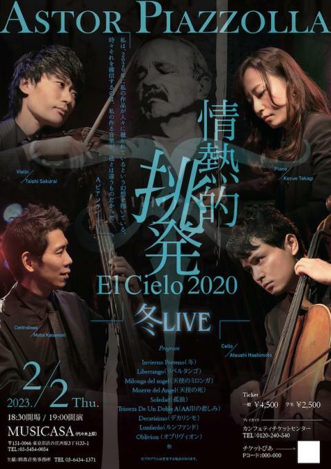 El Cielo 2020 ~情熱的挑発~ 冬LIVE 23/2/2(木) ムジカーザ シェア ツイート ピアソラの楽曲を専門に奏するピアノ・ヴァイオリン・チェロ・コントラバスによる四重奏団 公演情報 ジャンル 器楽 室内楽 料金 全席自由 一般-4,500円 全席自由 学生-2,500円 表示できるチケット情報はありません詳しくはこちら キャスト&スタッフ 出演 桜井大士 橋本專史 金森基 高木梢 お問い合わせ 森音楽事務所 シェア ツイート