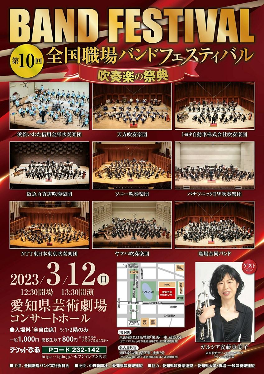 第10回全国職場バンドフェスティバル 23/3/12(日) 愛知県芸術劇場 コンサートホール シェア ツイート 公演情報 ジャンル 吹奏楽 自由席=1・2階を使用。未就学児童は入場不可。 料金 自由席 一般-1,000円 自由席 高校生以下-800円 自由席 高校生以下-6歳~高校生 表示できるチケット情報はありません詳しくはこちら キャスト&スタッフ 出演 浜松いわた信用金庫吹奏楽団 天方吹奏楽団 トヨタ自動車(株)吹奏楽団 阪急百貨店吹奏楽団 ソニー吹奏楽団 パナソニックEW吹奏楽団 NTT東日本東京吹奏楽団 ヤマハ吹奏楽団 ゲスト ガルシア安藤真美子 お問い合わせ 全国職場バンド実行委員会 シェア ツイート