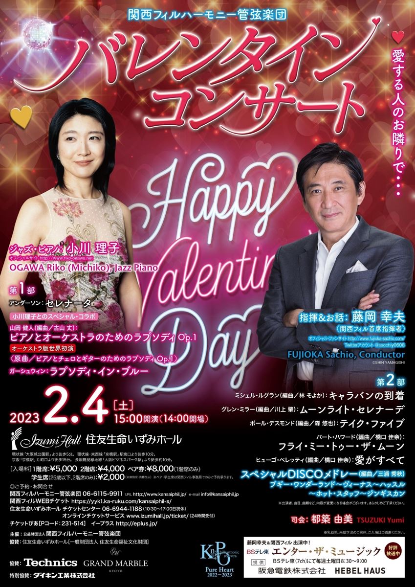 関西フィルハーモニー管弦楽団 バレンタインコンサート 23/2/4(土) 住友生命いずみホール シェア ツイート 公演情報 ジャンル オーケストラ 学生席は取扱いなし。未就学児童は入場不可。ペア券は2枚単位(合計8000円)での販売。出演者、曲目、曲順など、内容が変更になる場合がございます。あらかじめご了承ください。 料金 1階席-5,000円 2階席-4,000円 ペア席-4,000円 1階席-指定 2階席-指定 ペア席-指定、1名分、1階席 表示できるチケット情報はありません詳しくはこちら キャスト&スタッフ 指揮 藤岡幸夫 管弦楽 関西フィルハーモニー管弦楽団 ピアノ 小川理子 お問い合わせ 関西フィルハーモニー管弦楽団 公式サイト シェア ツイート