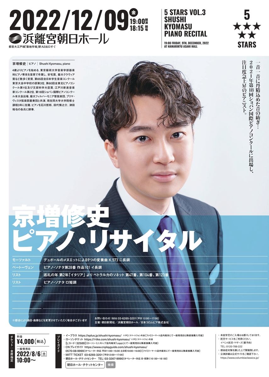 京増修史ピアノ・リサイタル 22/12/9(金) 浜離宮朝日ホール シェア ツイート モーツァルト:デュポールのメヌエットによる9つの変奏曲 K.573 ニ長調/ベートーヴェン:ピアノ・ソナタ第28番 作品101 イ長調/リスト:巡礼の年 第2年「イタリア」より ペトラルカのソネット 第47番、第104番、第123番/ピアノ・ソナタ ロ短調 公演情報 ジャンル ピアノ・鍵盤楽器 料金 全席指定-4,000円 キャスト&スタッフ ピアノ 京増修史 お問い合わせ Mitt 公式サイト シェア ツイート