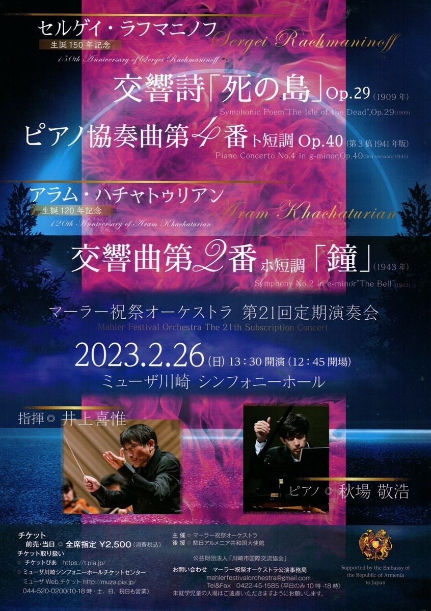 マーラー祝祭オーケストラ 23/2/26(日) ミューザ川崎シンフォニーホール シェア ツイート ラフマニノフ:交響詩「死の島」Op.29/ラフマニノフ:ピアノ協奏曲第4番ト短調Op.40(最終校訂版)/ハチャトゥリアン:交響曲第2番ホ短調「鐘」 公演情報 ジャンル オーケストラ 未就学児童は入場不可。 料金 指定席-2,500円 表示できるチケット情報はありません詳しくはこちら キャスト&スタッフ 指揮 井上喜惟 管弦楽 マーラー祝祭オーケストラ ピアノ 秋場敬浩 お問い合わせ マーラー祝祭オーケストラ公演事務局 公式サイト シェア ツイート