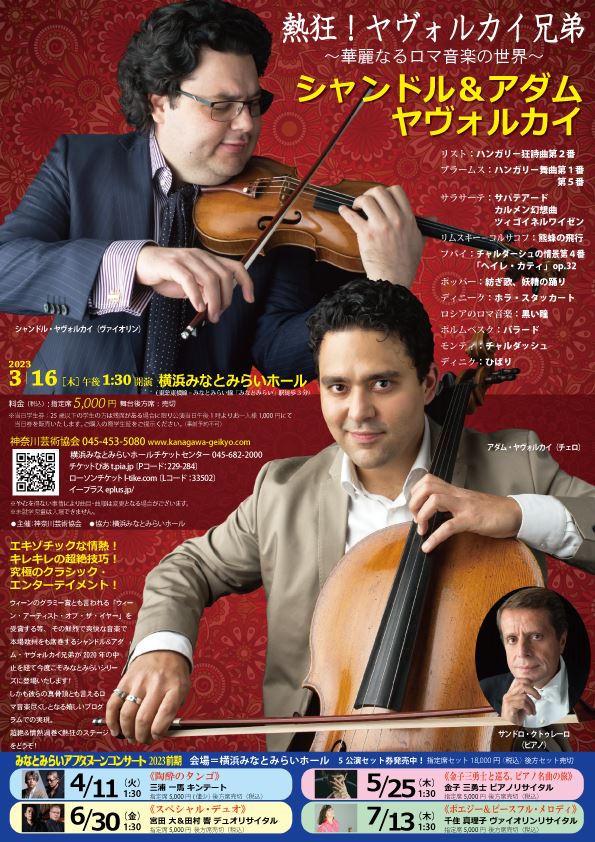 ヤヴォルカイ兄弟 23/3/16(木) 横浜みなとみらいホール 大ホール シェア ツイート 《熱狂!ヤヴォルカイ兄弟~華麗なるロマ音楽の世界~》 公演情報 ジャンル 器楽 室内楽 未就学児童は入場不可。出演者・曲目は予定のため変更の可能性あり。他に5公演セット券あり、Pコード:780-388参照。 料金 全席指定-5,000円 舞台後方席-3,000円 表示できるチケット情報はありません詳しくはこちら キャスト&スタッフ 出演 アダム・ヤヴォルカイ シャンドル・ヤヴォルカイ 共演 サンドロ・クトゥレーロ お問い合わせ 神奈川芸術協会 公式サイト シェア ツイート