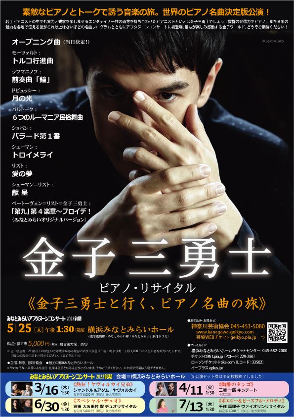 金子三勇士 ピアノ・リサイタル 23/5/25(木) 横浜みなとみらいホール 大ホール シェア ツイート 《金子三勇士と巡る、ピアノ名曲の旅》 公演情報 ジャンル ピアノ・鍵盤楽器 未就学児童は入場不可。曲目は予定のため変更の可能性あり。他に5公演セット券あり、Pコード:780-388参照。 料金 全席指定-5,000円 舞台後方席-3,000円 表示できるチケット情報はありません詳しくはこちら キャスト&スタッフ ピアノ 金子三勇士 お問い合わせ 神奈川芸術協会 公式サイト シェア ツイート